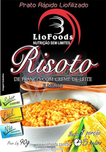 Prato rápido liofilizado sabor risoto de frango, creme de leite e milho que serve até 2 porções.