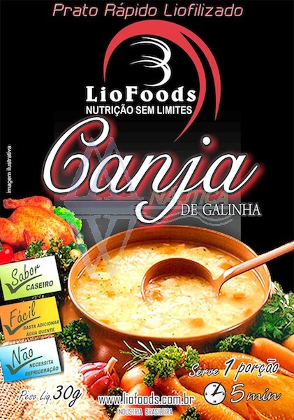 Prato rápido liofilizado sabor canja de galinha que serve até 1 porção.